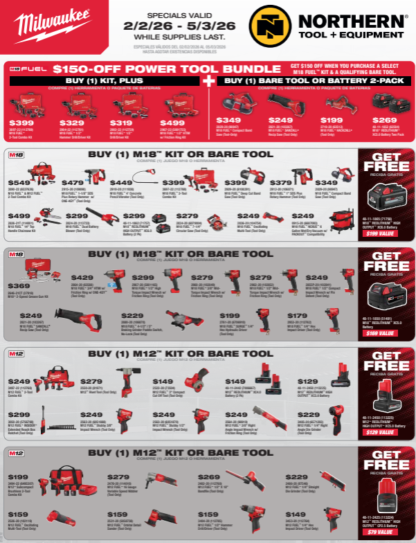 CURRENT PROMOTIONS / FOCUSES & E-REBATES FEB - MAY FLYER FEB - MAY E-REBATES FLYER WIP CORE PROMOTIONS CONCRETE PROMOTIONS PACKOUT OFFERINGS CATALOGS & SOLUTIONS GUIDES PERSONAL PROTECTIVE EQUIPMENT PACKOUT RED LITHIUM BLUETOOTH EARBUDS PPE AT NORTHERN INSIDER EXTENDED REACH BOX RATCHET OUTDOOR POWER EQUIPMENT M18 FORGE AND DUAL BAY SUPER CHARGER AUTOMOTIVE SOLUTIONS ACCESSORIES GUIDE PLUMBING AND MECHANICAL PRESS TOOLS CRIMPERS SAFETY WEEK SAFETY PILLARS COOLING SOLUTIONS HAND PROTECTION BOLT & BOLT ACCESSORIES STAY ALERT-STAY VISIBLE SAFETY TECHNOLOGY
